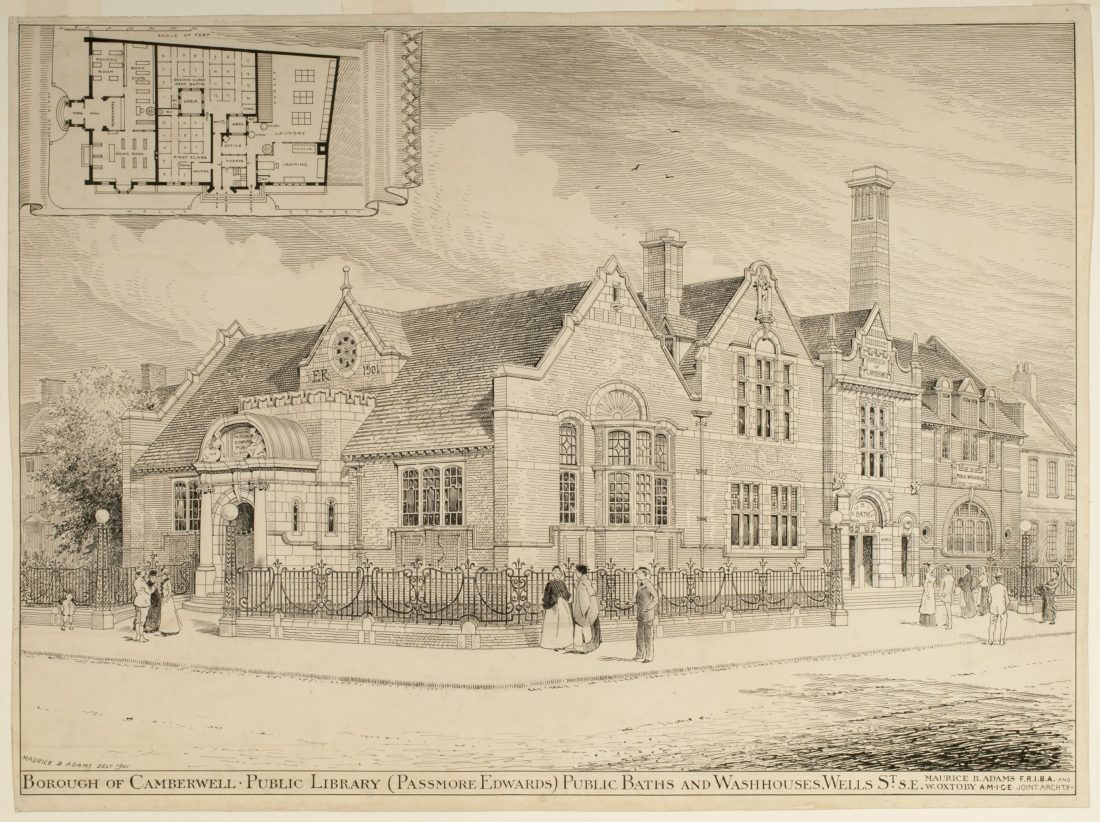 As hoped, in 1898 a technical institute opened next to the gallery (now Camberwell College of Arts). Once again it was financed by Passmore Edwards. The £5,000 he gave for this new institution also enabled the partial rebuilding of the South London Art Gallery so as to connect its buildings with those of the college, enabling them to operate, initially at least, as one organisation. This generosity was entirely in keeping with Passmore Edwards’ personal ethos to ‘do the best for the most.’ Like William Rossiter, founder of the South London Art Gallery, he was a firm believer in the Public Library Act which had given local boroughs the power to set up libraries which were free and open to all. Despite the Act being introduced in 1850 free libraries were slow to appear, and Passmore Edwards’ role in aiding their establishment across London should not be underestimated. Of the roughly 70 major buildings built with his support, 24 were libraries including ones in Nunhead (opened 1896), Dulwich (opened 1897), Whitechapel (opened 1892) and Hammersmith (opened 1896), to name just a few. The library he paid for on Wells Way in Camberwell (opened 1903) also included a public washhouse in recognition of the fact that few homes in the neighbourhood had private baths.