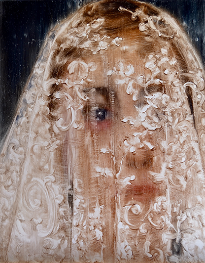 Recently I’ve become a little obsessed with rendering lace – it’s really fun breaking the film of my oil paint with various brushes and silicone shaper tools to describe the texture and patterns of the fabric. And there’s the same push/pull of clarity and ambiguity when describing a face behind a lace veil. Hopefully a full series of works can come from this …